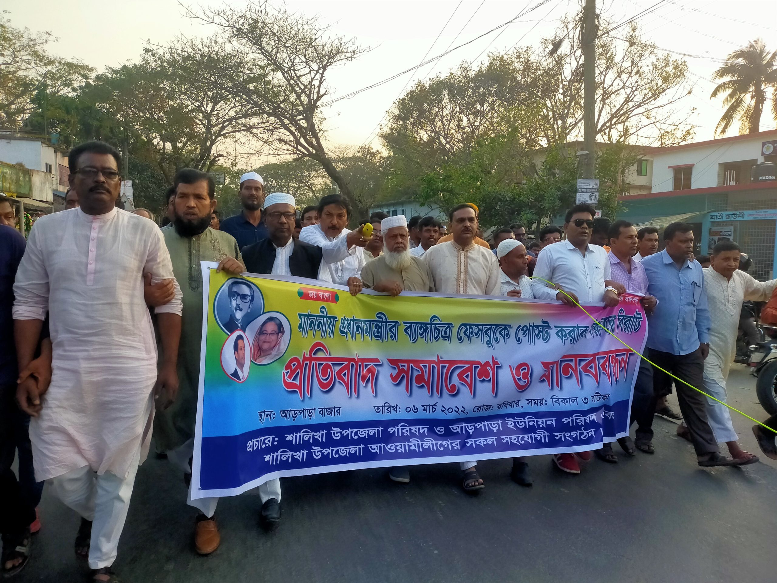 শালিখায় মাননীয় প্রধানমন্ত্রীর ব্যঙ্গচিত্র ফেসবুকে পোস্ট করার বিরুদ্ধে মানববন্ধন ও প্রতিবাদ সমাবেশ অনুষ্ঠিত হয়েছে। আজ রোববার বিকাল ৫ টায় শালিখা উপজেলা পরিষদ, আড়পাড়া ইউনিয়ন পরিষদ এবং শালিখা উপজেলা আওয়ামী লীগের সকল সহযোগী সংগঠনের আয়োজনে এ উপলক্ষে আয়োজিত প্রতিবাদ মিছিল আড়পাড়া ইউনিয়ন পরিষদ থেকে শুরু হয়ে আড়পাড়া বাজার প্রদক্ষিণ করে পুনরায় স্বস্থানে গিয়ে শেষ হয়।