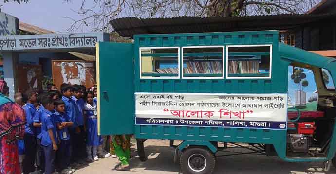 শালিখা উপজেলা পরিষদের পরিচালনায় ও শহীদ সিরাজউদ্দিন হোসেন পাঠাগারের উদ্যোগে যাত্রা শুরু করেছে ভ্রাম্যমান লাইব্রেরি ‘আলোক শিখা’। মুল্যবান বই শিক্ষার্থীদের দোরগোড়ায় পৌছে দিয়ে বই পড়ার আগ্রহ তৈরি করার এই অনন্য উদ্যোগ প্রশংসনীয়। ছবিতে আজ শালিখার আড়পাড়া মডেল সরকারি প্রাথমিক বিদ্যালয়ে শিক্ষার্থীদের কাছে বই নিয়ে হাজির ‘আলোক শিখা’।