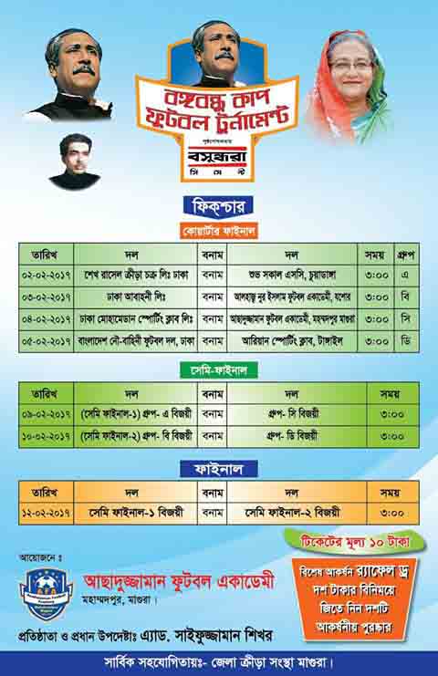 মাগুরা বীর মুক্তিযোদ্ধা আছাদুজ্জামান স্টেডিয়ামে উৎসবমুখর পরিবেশে চলছে ‘বঙ্গবন্ধু কাপ ফুটবল টুর্নামেন্ট ২০১৭’।