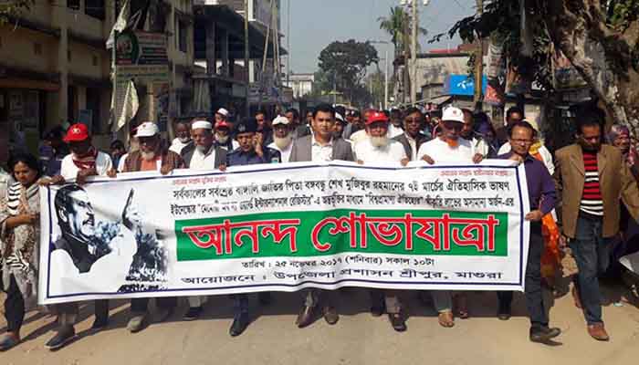 জাতির জনক বঙ্গবন্ধু শেখ মুজিবুর রহমানের ঐতিহাসিক ৭ই মার্চের ভাষণকে দেওয়া ইউনেস্কোর স্বীকৃতি উদযাপনে শ্রীপুরে আনন্দ শোভাযাত্রা অনুষ্ঠিত হয়েছে।