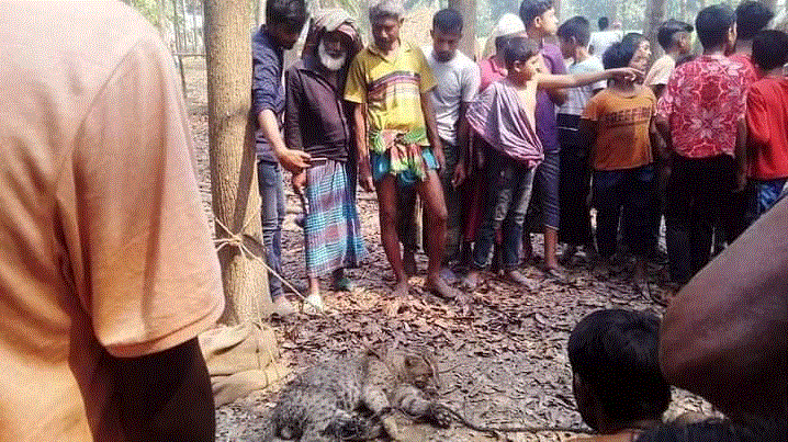 জানা যায়, রোববার সকাল ১১টার দিকে রঞ্জু বিশ্বাস মাঠে কাজ করছিল। একটু দুরে কয়েকটি কুকুরের চিৎকার শুনতে পাই তিনি। একটু এগিয়ে গিয়ে তিনি গাছে একটি মেছো বাঘ দেখতে পাই। পরে গ্রামবাসীর সহযোগিতায় মেছো বাঘটিকে আটক করা হয়।